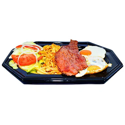 Plato combinado que consta de un sabroso filete de ternera, ensalada, dos huevos a la plancha y una pequeña ración de nuestras deliciosas patatas fritas naturales.